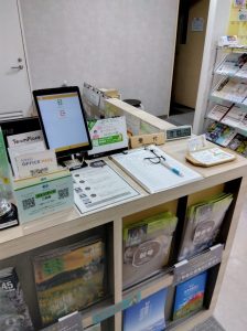 来客されたお客様はこの受付で台帳記入もしくはQRコードで入館許可の認証を受けます。